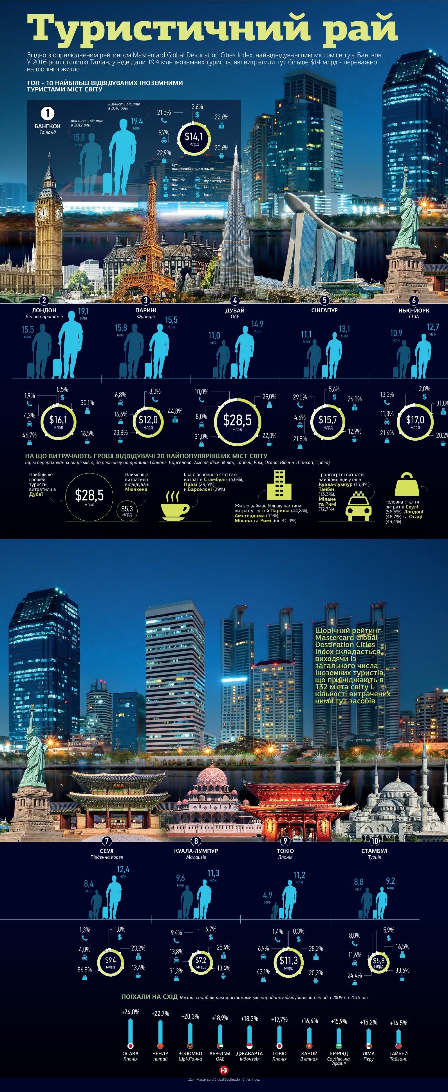 Інфографіка створена за інформацією щорічного рейтингу Mastercard Global Destination Cities Index, який складається, виходячи із загальної кількості іноземних туристів, які приїжджають у 132 міста світу, та кількості витрачених ними тут коштів.