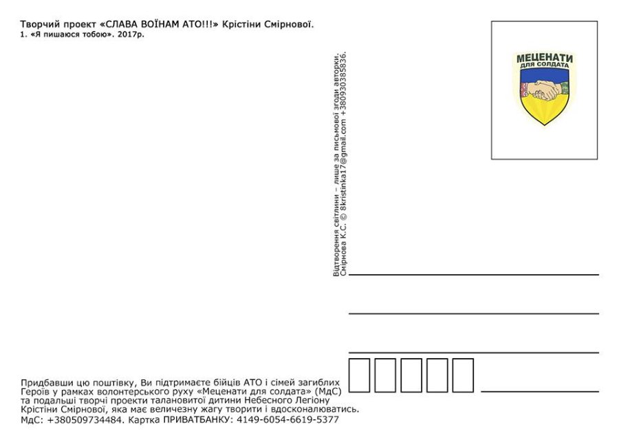 "Ми всі також можемо долучитись до хорошої справи і допомогти талановитій дитині й надалі творити та вдосконалюватись! Адже придбавши цю патріотичну поштову картку під назвою «Я пишаюся тобою» із серії «СЛАВА ВОЇНАМ АТО» кожен зможе внести і свою вагому чи символічну частку у її творчість".