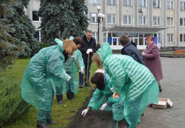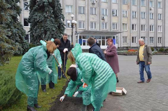Сьогодні працівники виконавчого комітету разом з міським головою Олегом Кіндером, секретарем міської ради Вірою Федосюк під час обідньої перерви висадили цибулини тюльпанів на площі Героїв Майдану.