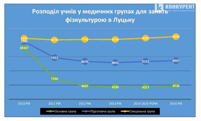 Лише 21% школярів Луцька у минулому році займалися фізкультурою у загальній медичній групі. 38,4% ходили до спеціальної групи і ще 40,3% до підготовчої медичної групи.