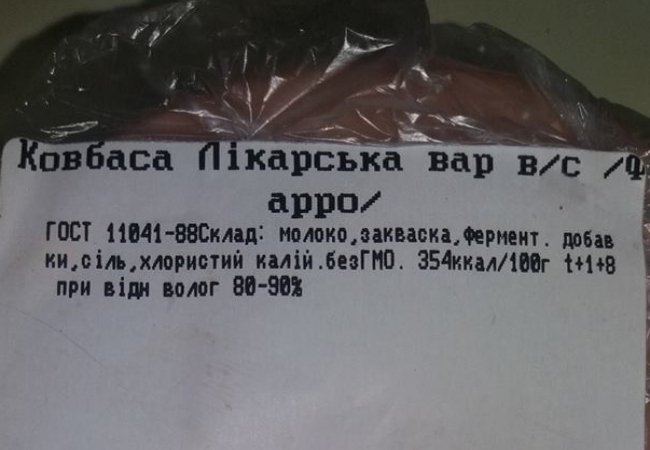 Луцький фотограф Павло Березюк опублікував у Facebook світлину, на якій зафіксував склад ковбаси "Лікарська".