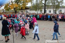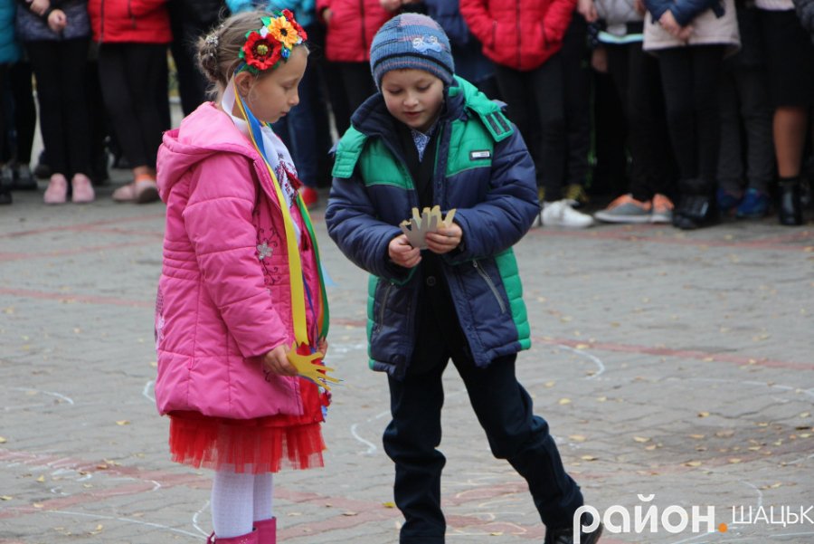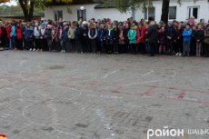 Потім на майданчику біля школи учні молодших класів на чолі з вчителем початкових класів Лідією Михальчук організували флешмоб: ромашку, намальовану на майданчику біля школи, і в якої було 26 пелюсток з назвами усіх областей України та Криму, по черзі заповнили учні молодших класів, тримаючи в руках жовто-блакитні паперові долоньки як символ миру, віри та надії, що Україна все-таки буде єдиною та незалежною державою.