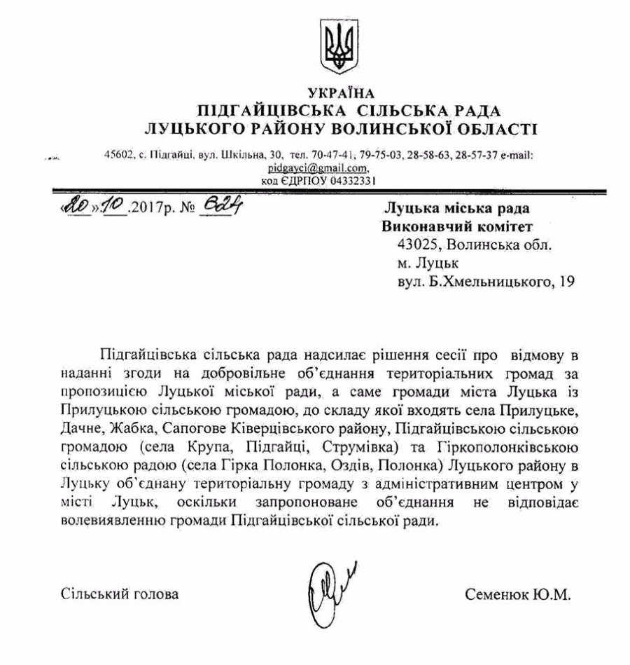 Підгайцівська сільська рада відмовилась об’єднуватись з Луцьком.