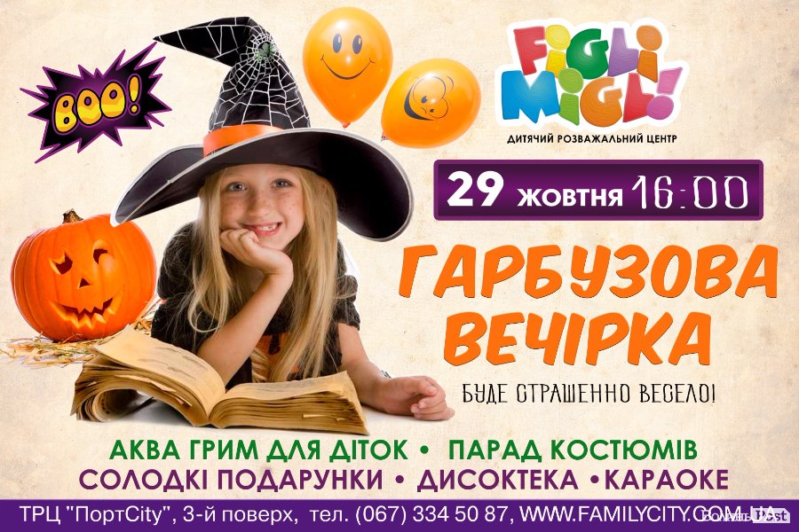Хелоуін – свято, яке люблять малюки за можливість одягти цікаві костюми й отримати чимало солодощів. Дитячий розважальний центр «Figli Migli» пропонує прийти на Гарбузову вечірку. Організатори обіцяють, що буде страшно весело.