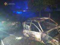 Внаслідок пожежі один з автомобілів знищений вогнем, в іншому пошкоджене лакофарбове покриття, моторний відсік та два колеса.