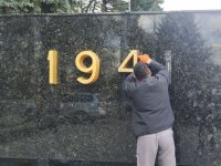 На іншому боці меморіалу майстри оновлюють цифри закінчення Другої світової війни