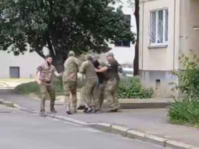 На відео видно, що шестеро співробітників ТЦК забирають чоловіка до мікроавтобуса.