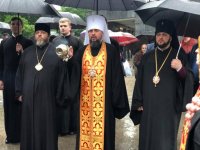Митрополит Київський та усієї України спочатку поклав квіти біля стели героїв Небесної Сотні та воїнів АТО, яка знаходиться у центрі Рівного