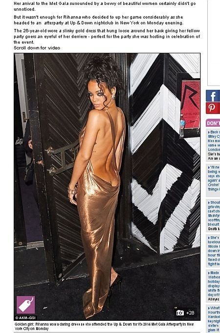 Як було видно неозброєним оком, ані бюстгальтера, ані трусів на Ріанні не було. Усі присутні могли помилуватися щілинкою її попи в вирізі сукні.