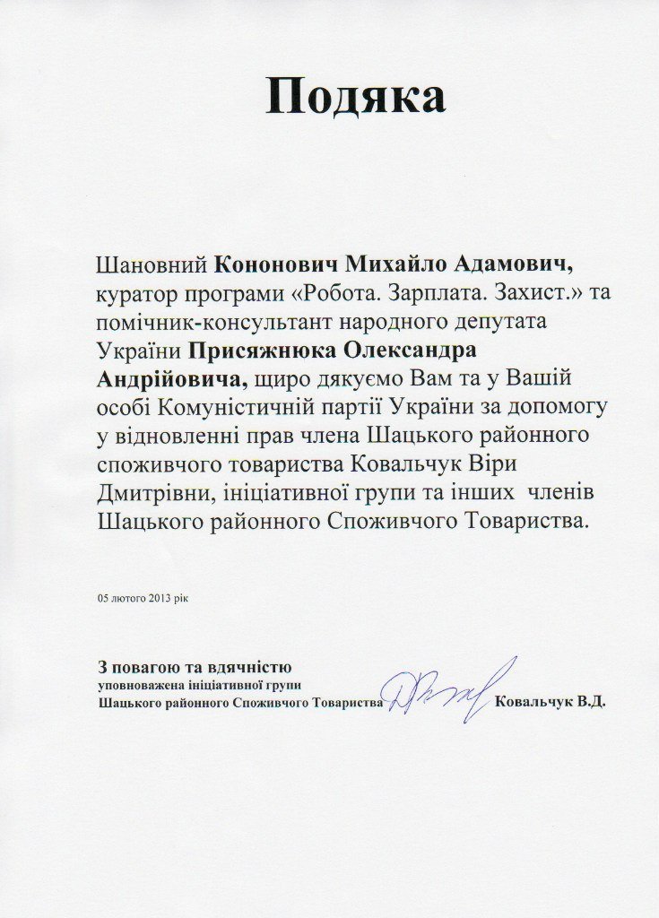 Тому Віра Дмитріївна звернулася по допомогу до КПУ, а саме до куратора проекту «Робота. Зарплата. Захист.» у Волинській області Кононовича Михайла Адамовича. Тут зневірена жінка отримала реальну допомогу і завдяки комуністам таки відстояла свої права у суді. Комуністи запевнили громадянку, що і надалі при необхідності будуть допомагати членам споживчого товариства у різних питаннях.