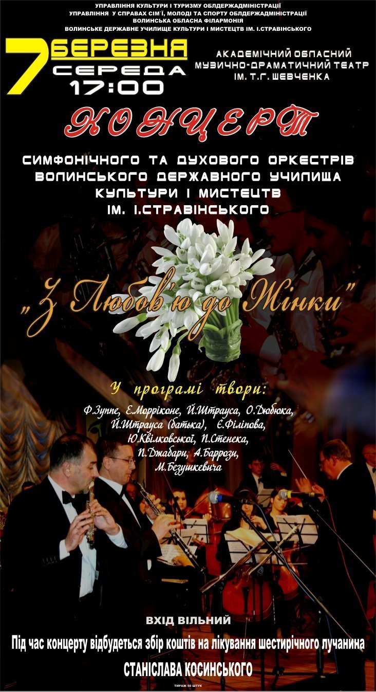 7 березня 2012 року запрошують на святковий концерт симфонічного та духового оркестрів Волинського державного училища культури і мистецтв ім. Стравінського.
