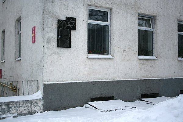 Дошка присвячена євреям-борцям. На ній зараз висить наклейка про фанатів київського футбольного клубу "Динамо". Наклейка затуляє частину букв на меморіальній дошці.