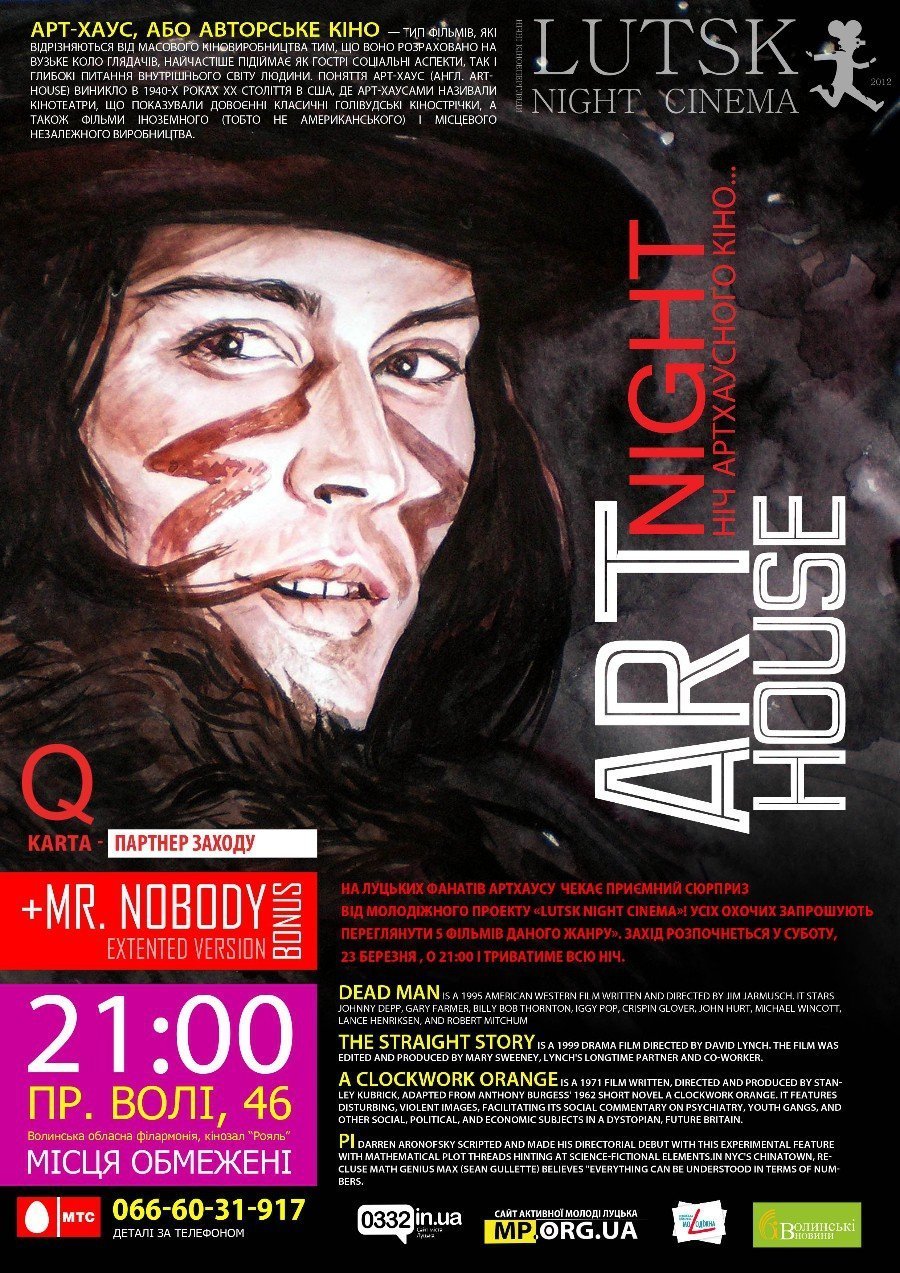 23 березня, у суботу, вже традиційно на луцьких кіноманів чекає ніч фільмів від «Lutsk Night Cinema». Цього разу організатори вирішили показати 5 стрічок у жанрі «арт-хаус». До слова, частину з них обрали учасники групи «Lutsk Night Cinema» вконтакті, проголосувавши за улюблені фільми.