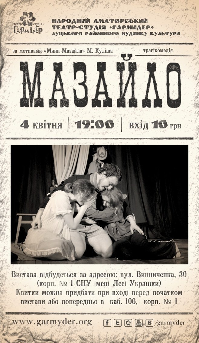 У четвер, 4 квітня, о 19:00 Народний аматорський театр-студія «ГаРмИдЕр» Луцького районного будинку культури покаже виставу «Мазайло» (за мотивами п’єси М. Куліша «Мина Мазайло») для студентів і всіх бажаючих за студентською ціною.