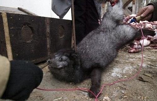 Ежегодно на китайских зверофермах гибнут сотни тысяч зверьков. Перед тем, как снять шкуру, животное только слегка оглушают, затем ему отрезают лапы и шкуру начинают снимать, когда еще когда зверек находится в сознании и все чувствует.