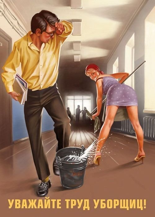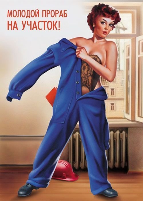 На плакатах с такими, казалось бы, совершенно несексуальными названиями как «Оказывай помощь начинающему водителю», «Уважайте труд уборщиц», «Не теряй рабочих минут!», «Не отвлекай водителя во время движения!», сияют свежестью яркие красавицы с пышными формами. Как вы думаете, если бы в СССР действительно висели на стенах такие плакаты, смогли бы они добавить улыбок советским людям? Ведь на фотографиях тех времен у людей унылые, мрачные лица.