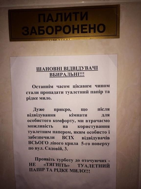 У туалеті Верховної Ради з’явилося оголошення з проханням не красти туалетний папір і мило. Відповідне фото оприлюднила на своїй сторінці в соцмережі Facebook народний депутат Ганна Романова.
