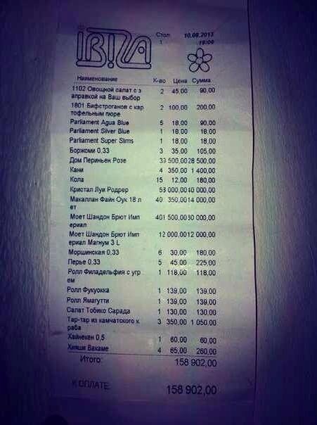 «В сеть попал чек компании, здорово погулявшей в Ibiza (в Одессе). Ребята сначала покушали овощной салатик и бефстроганов, а потом уже начали пить и курить. Они не скупились на "Дом Периньон" или "Моет Шандон", перекусывали суши, и в итоге накутили почти на 159 тысяч гривен.»
