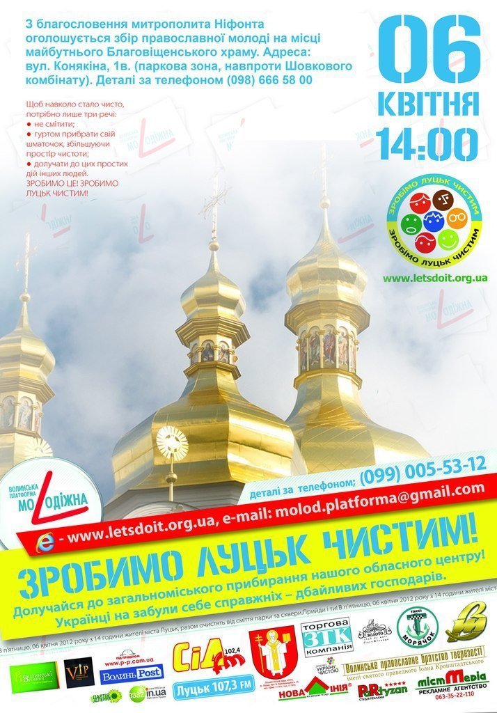 В рамках заходу "ЗРОБИМО ЛУЦЬК ЧИСТИМ!" , з благословення митрополита Ніфонта оголошується збір православної молоді на місці майбутнього Благовіщенського храму. Адреса: вул. Конякіна , 1в (паркова зона, навпроти Шовкового комбінату).