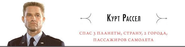 Спас: планету от угрозы из параллельного мира («Звездные врата»), планету от инопланетных паразитов («Нечто»), главу государства («Побег из Нью-Йорка»), США от вирусного оружия («Побег из Лос-Анджелеса»), жителей Лос-Анджелеса от банды серийных убийц («Проклятый сезон»), немногочисленное население планеты Аркадии («Солдат»), пассажиров самолете Боинг-747 от террористов («Приказано уничтожить»), население города Тумстоун от банды убийц («Тумстоун»)