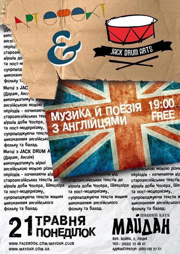 Мистецька організація "Арт Ефект" та англійський гурт Jack drum arts представляють подію - "Музика й поезія з англійцями".