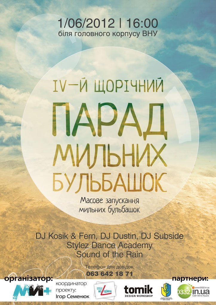 Сьогодні 1 червня 2012 року, у Міжнародний день захисту дітей, о 16.00 на площі перед головним корпусом Волинського національного університету ім. Лесі Українки відбудеться ІV-ий щорічний Парад мильних бульбашок.