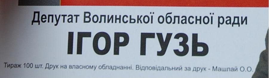 Розуміючи, що в молодого депутата недостатньо політичного досвіду, хочемо дати пану Гузю одну практичну і безкоштовну пораду, яка йому доже допоможе на виборах. Пане Гузь, якщо ви вже друкуєте листівки, пишіть на них правдивий тираж, а не так, як ви зробили у Ратному, написавши на листівках тираж 100 шт. та приперши їх кілька тисяч. Бо через це можна і з виборів вилетіти. Зовсім. І не через «бандитську владу», а через власну дурість.