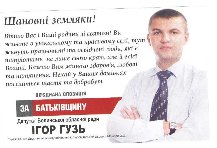 Ну і ще одним здивування на цьому святі життя та безпринципності були листівки. Байдуже, що знову їхня кількість не відповідала заявленому тиражеві. Байдуже, що вже почалася виборча кампанія. Байдуже, що текст для жителів двох різних сіл, де розповсюджували листівки, був ідентичним. Ну ми ж не зануди, щоб це помічати. Головне, що на листівках мирянам явили нового, рестайлінгового Гузя. Порівняйте самі - Гузь у Ратному