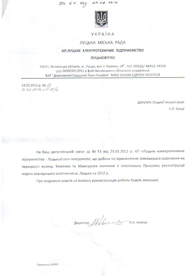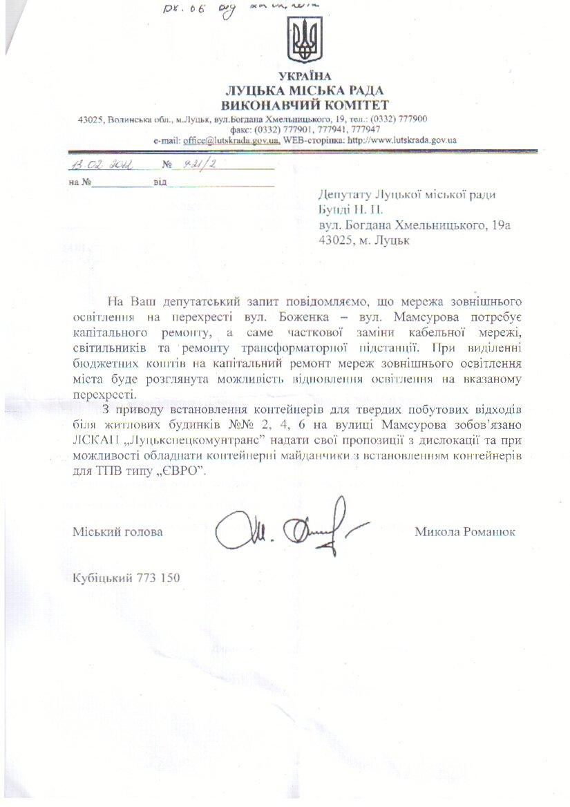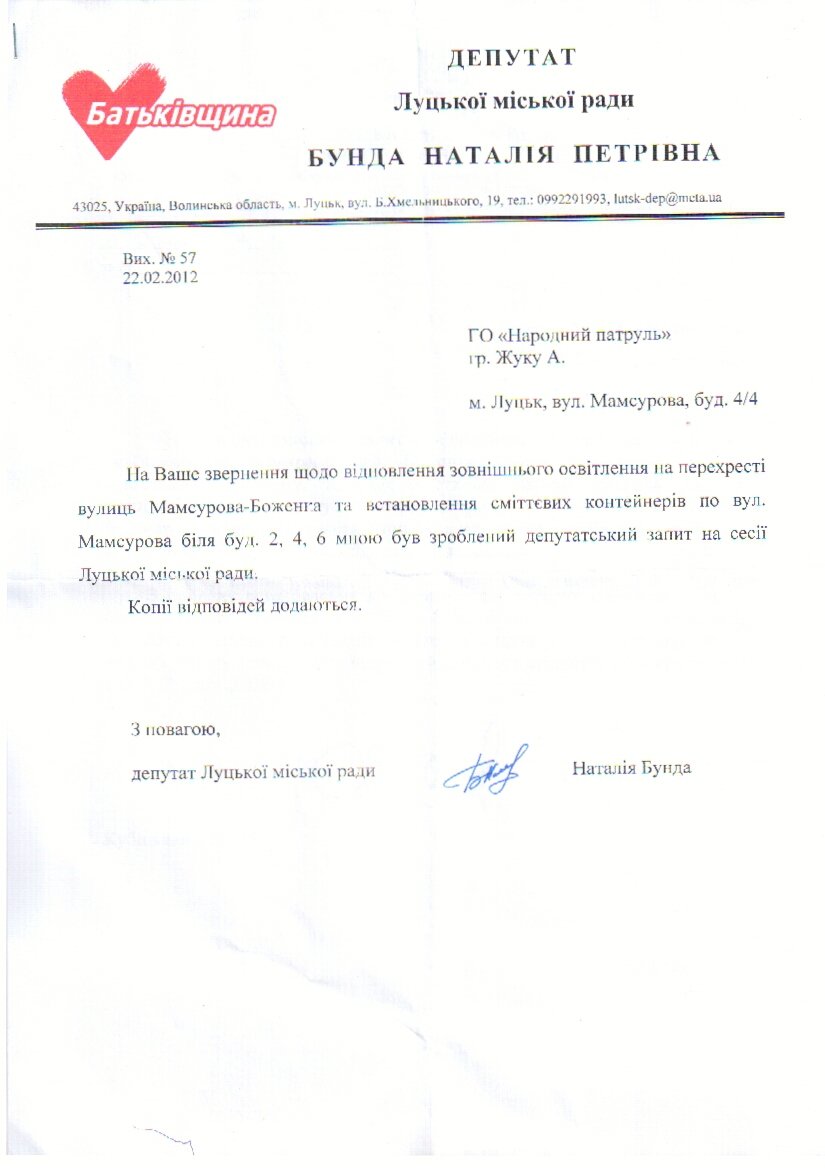 - Спочатку я думав звернутися прямо до міського голови. Але потім подумав: а нащо ж вибираються депутати-мажоритарщики? Звісно, для того, щоб донести про проблеми міста міському голові. Сам мер усіх проблем не знатиме, та не впорається геть з усім. Тому я вирішив звернутися, до депутата Наталії Бунди, аби все ж таки вирішити з освітленням. Спочатку вона уважно мене вислухала. Я зібрав близько ста підписів від мешканців трьох багатоповерхівок, і одразу ж на першій сесії міської ради пані Наталія зробила депутатський запит щодо зовнішнього освітлення вулиць (перехрестя Мамсурова-Боженка). Приблизно через місяць на мою домашню пошту прийшла відповідь(у додатку) від міської ради.