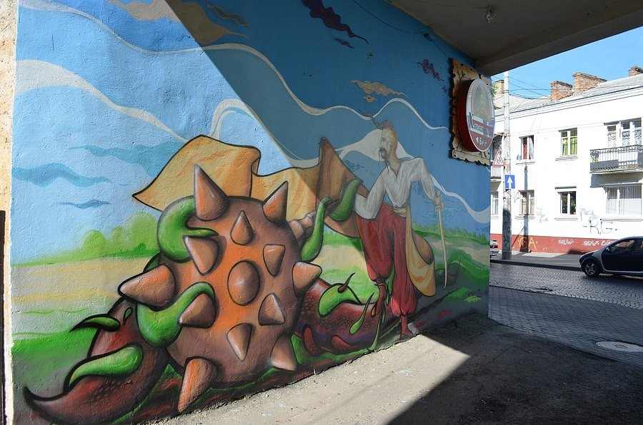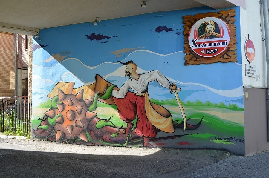 Луцька міська влада запропонувала місцевим вуличним художникам розмалювати міські стіни. Почали з арки на Хмельницького. За серпень зробили малюнок з козаком.