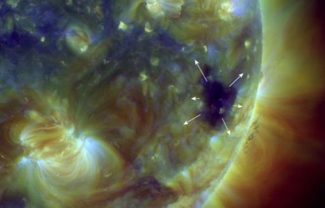 Вблизи западного диска Солнца орбитальные обсерватории НАСА зафиксировали крупную корональную дыру. Внешне она выглядит как темная материя.