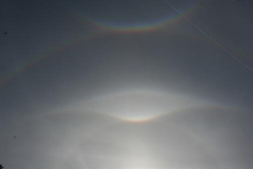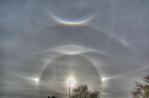 Невероятно красивые снимки сделали сотрудники Центра космических полетов имени Джорджа Маршалла в Ханствилле, штат Алабама, когда Средне-Атлантическая часть США находилась в зоне поражения урагана "Сэнди". Ученые стали свидетелями удивительного оптического явления: сложного переплетения светящихся дуг и колец вокруг полуденного солнца