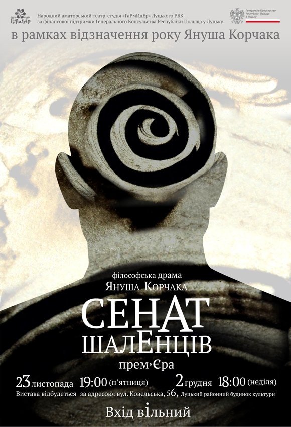 Театр-студія «ГаРмИдЕр» Луцького районного будинку культури та Генеральне консульство Республіки Польща у місті Луцьку запрошують на прем’єру філософської драми Януша Корчака «Сенат шаленців».