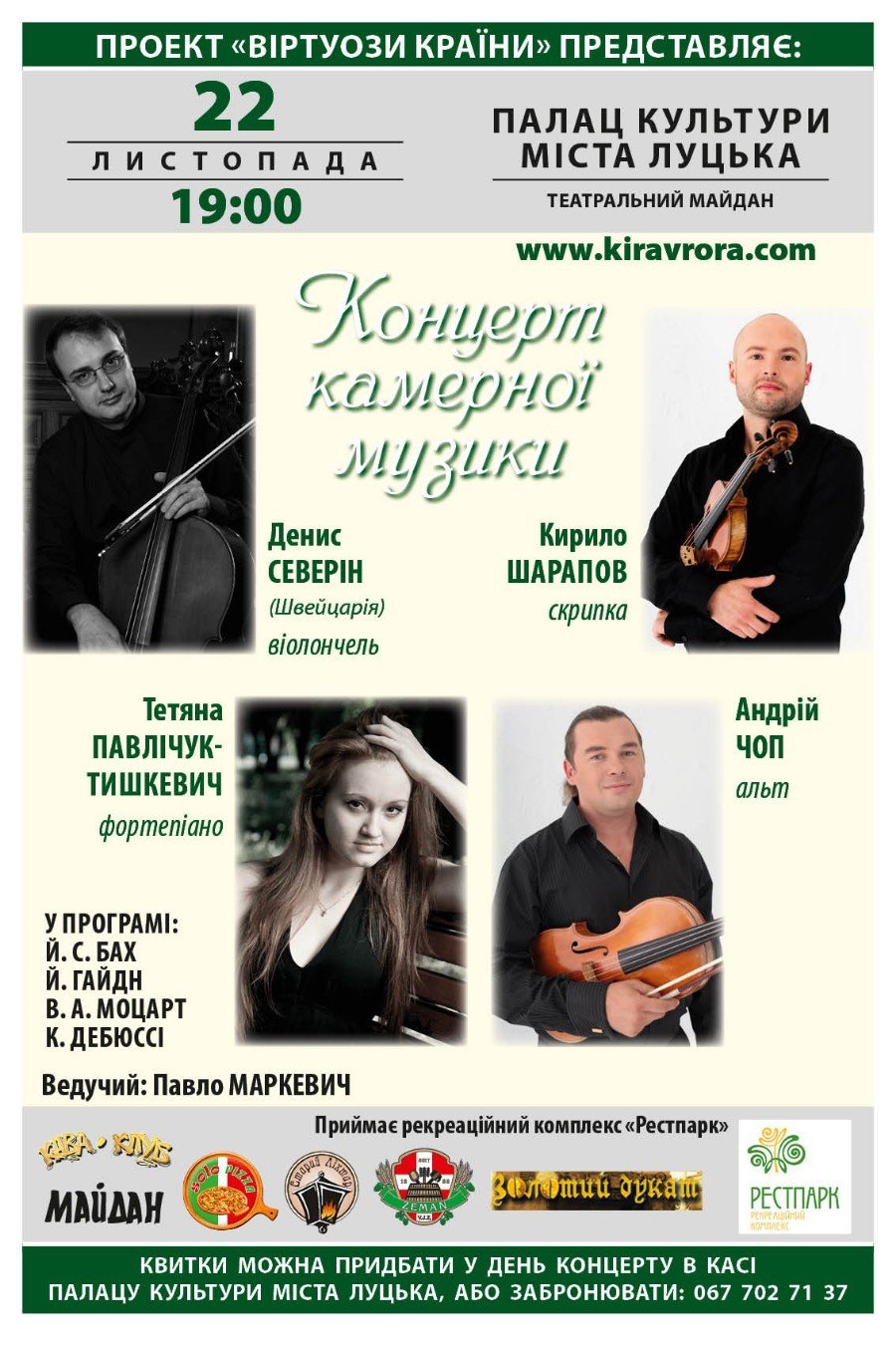 22 листопада 0 19:00 в Палацу культури міста Луцька для Вас гратимуть Тетяна Павлічук-Тишкевич (фортепіано), Кирило Шарапов (скрипка), Денис Северін (Швейцарія, віолончель) та Андрій Чоп (альт).